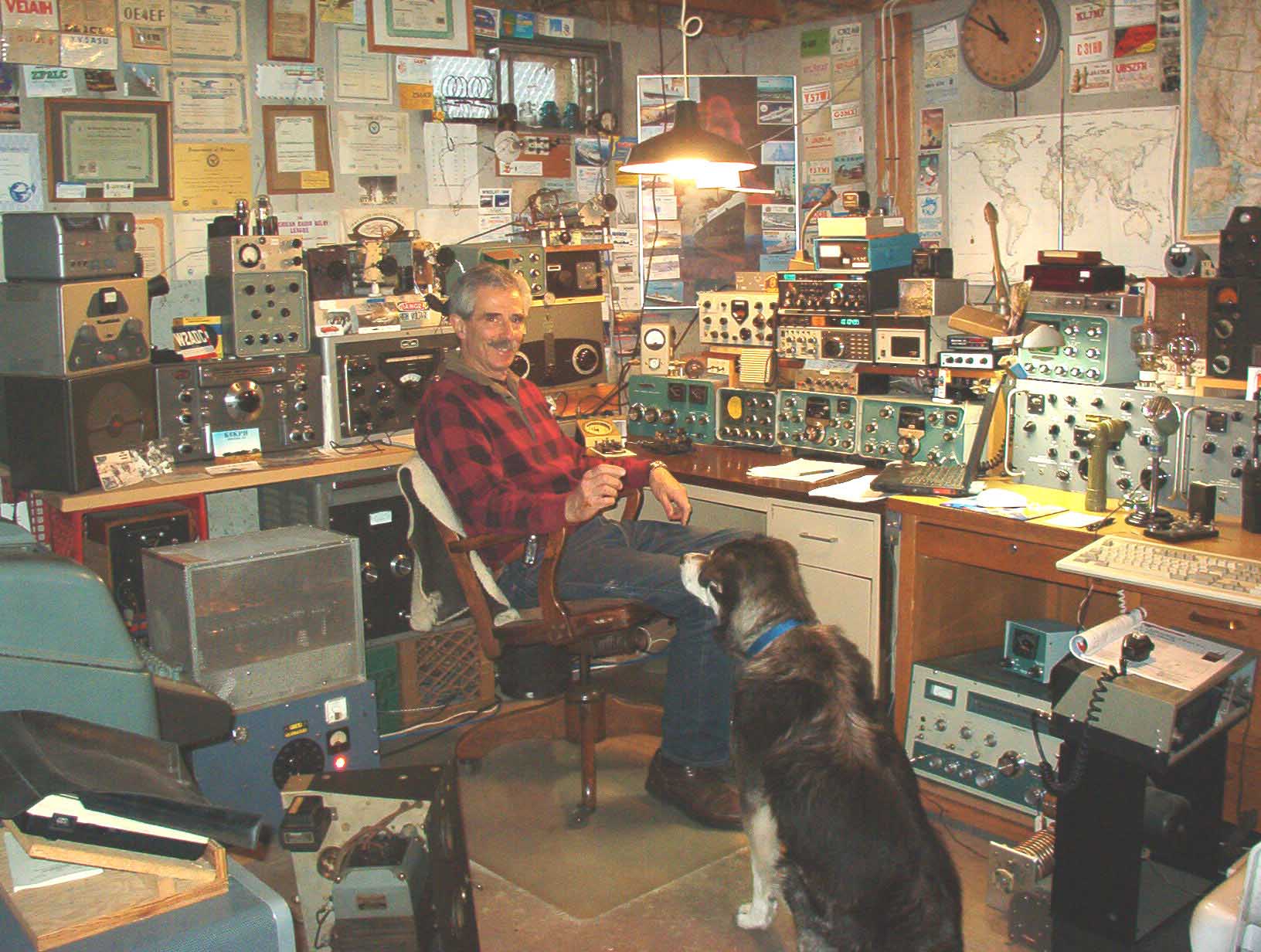 Here's "chief op" Alex with "second op" Smokey (now, sadly, a Silent Key) at the main operating position (May 2006). The main rig is a Ten-Tec Omni-V. It can drive one of three homebrew tube-type amplifiers or a Heathkit SB-220. The homebrew PIC-a-STAR (aka STAR) also covers 160M through 10M, SSB and CW. It drives a homebrew push-pull-parallel 4-MOSFET solid-state 600W amplifier. The Model 28 Teletype Corp. teleprinter is just visible on the left. A Heathkit Apache (for AM) resides on a dolly under the operating desk to the right. An Atlas 210-X is occasionally used mobile, and a Ten-Tec Argonaut 515 runs QRP. Receivers include a Collins 75A-4 (a gift from the estate of K7AK), a Collins 51J-4 with Hammarlund HC-10 SSB detector, a National HRO-60 (used with the Apache), a 1934 National HRO, a Stewart-Warner R-392, a Collins R-390, and a Motorola R-390A. Also visible is a 1957 Collins KWM-1 (arguably the world's first transceiver) and a Drake TR7-A. Boatanchors include a Heathkit AR-3 (my first receiver in 1959), a National NC-57, a National SW-54, Heathkit SB-303/SB-401 twins, a Hammarlund HQ-120-X, a Hallicrafters SX-99 (my 1959 Novice receiver), a Heath DX-35, and a Hammarlund HQ-180. The antenna farm consists of a center-fed doublet that's about 150-ft. long and at a ehight of about 70-ft. The feedline is homebrew open-wire line. The station also includes a pair of phased 1/4-wave verticals fed through a homebrew quadrature phase-shift network. Switched by relays, the pattern can be directed east or west. It operates in the 75M "DX window." The station also includes a 2-wire Beverage for receiving. The KISS Transceiver Click image for larger photo. The KISS project stemmed from a desire to build a simple selectable sideband SSB transceiver for one band. The goal was to achieve on-the-air performance that would be indistinguishable to a listener from that of any other transceiver heard on the band. Moreover, the rig would be simple enough to demonstrate that any Radio Amateur could duplicate it from junkbox parts and with a minimum of test equipment. It is far from state-of-the-art, but it reflects what can be done with junkbox parts. NOTE: If you're interested in a state-of-the-art high performance all-band transceiver, follow the links to the STAR project, above, and skip KISS. If you just want to get some ideas, read on. The design commenced with the rig's receiver section. The goal was performance that would make it stable and selective, with enough audio output power to drive a loudspeaker to normal room volume. A 9-MHz IF includes a steep-skirted crystal bandpass filter. The design would also have to include an AGC system that would permit listening to both strong and weak signals without having to make an AF gain control adjustment. It was decided to use a modular approach throughout the design and the KISS's construction. Individual modules, enclosed in small aluminum chasses, would be used, and circuit blocks would reside within these modules on appropriately partitioned sub-boards. Here's what the completed receiver section looks like. Click here for image. Click these tinted buttons for more circuit and construction details. The boxes show receiver circuits and modules, VFO, BFO, IF, SSB generator, TX mixer, driver and PA stages. All design goals were met. |