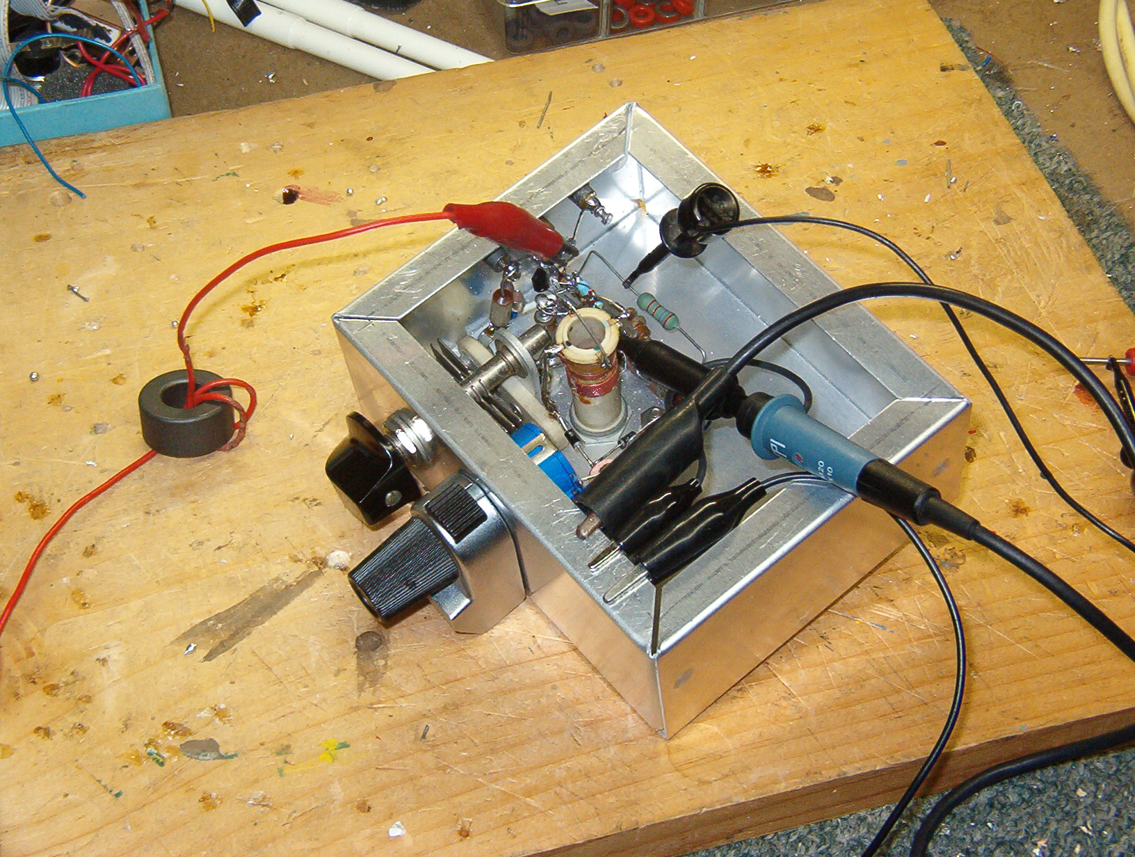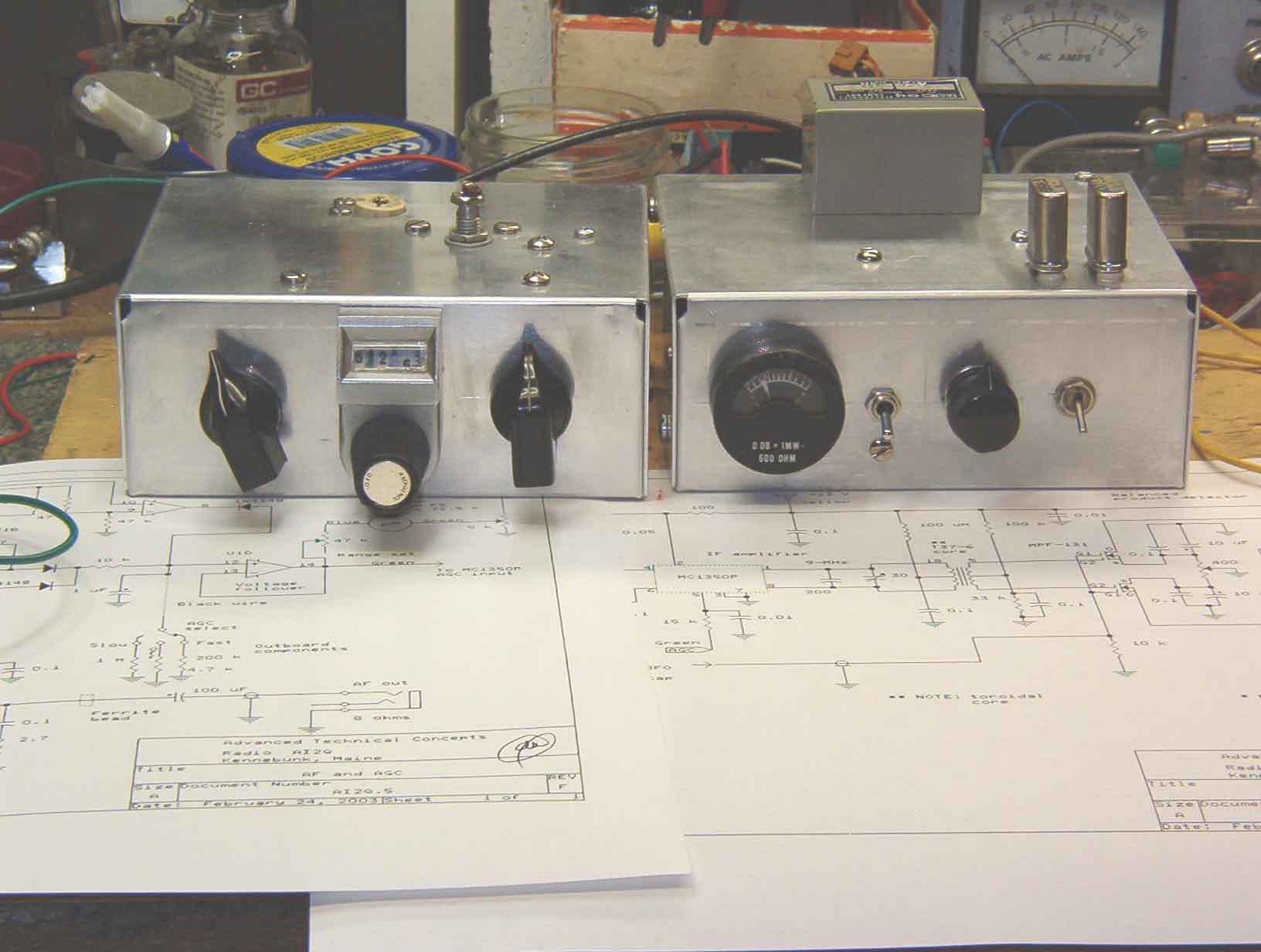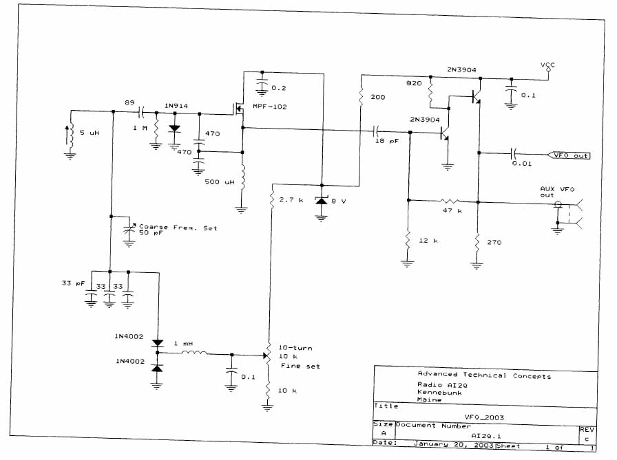 ![]() The Heart of The Transceiver The heart of the AI2Q 75-meter KISS transceiver (the dual-module receiver section shown above) is its VFO. Unlike previous homebrew rigs, where construction began at the receiver's audio output and proceeded "backwards" towards the front-end, it was deemed appropriate to build and test a VFO with demonstrable stability---and do it before construction of the rig's other modules began. The VFO Circuit A number of textbook circuits were considered for the rig's VFO, and the junkbox was then scrutinized carefully for optimum components, especially those that would be temperature-stable. Polystyrene dielectric and glass dielectric fixed capacitors (military types) were chosen, along with a ceramic slug-tuned coil form. A Colpitts oscillator forms the basis of the VFO. The main tuning capacitor is an old-fashioned heavy Hammarlund 50-pF variable. It's augmented by a "bandspread" circuit consisting of a 10-turn pot back-biasing a pair of ordinary 1N4002 power diodes. Varying the bias voltage on the diodes alters their depletion region, and thus their capacitance. Surprisingly, the diodes work well as varicaps. Overall, the VFO only drifts about 40-Hz/hr after a short initial warmup. The mechanical variable capacitor, and the VFO's inductor, are mounted directly on a subchassis, to ensure mechanical stability. Click here for a photo showing these components under test. In contrast, the VFO buffer circuitry is mounted on a circuit board. Click to continue. |