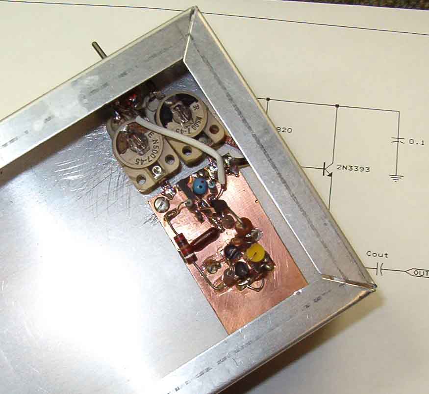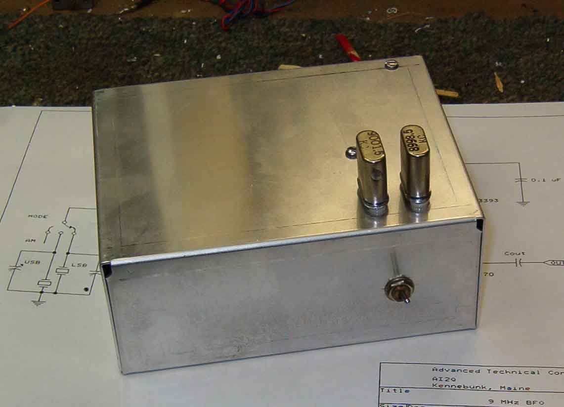 while putting the selected sideband within the filter. The two crystals provide product detector injection for either upper sideband detection, or lower sideband detection. The BFO output is also picked off and routed to an external panel connector for application to the transceiver's balanced modulator. The crystals are mounted in sockets, and are manually switched using a panel-mounted toggle switch. Although diode switching was considered in order to permit remote placement of the BFO circuit board, the small aluminum enclosures ensured that all leads between the board and the toggle switch would be sufficiently short. |