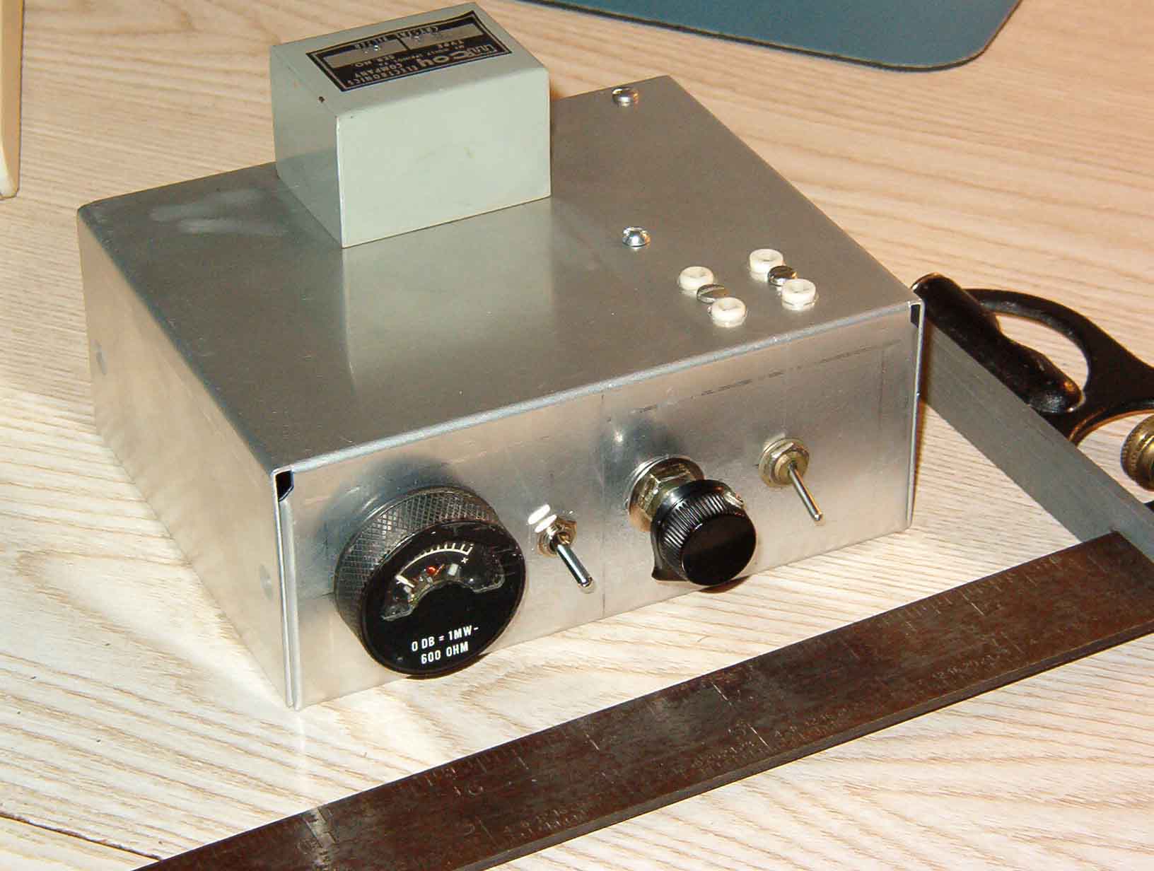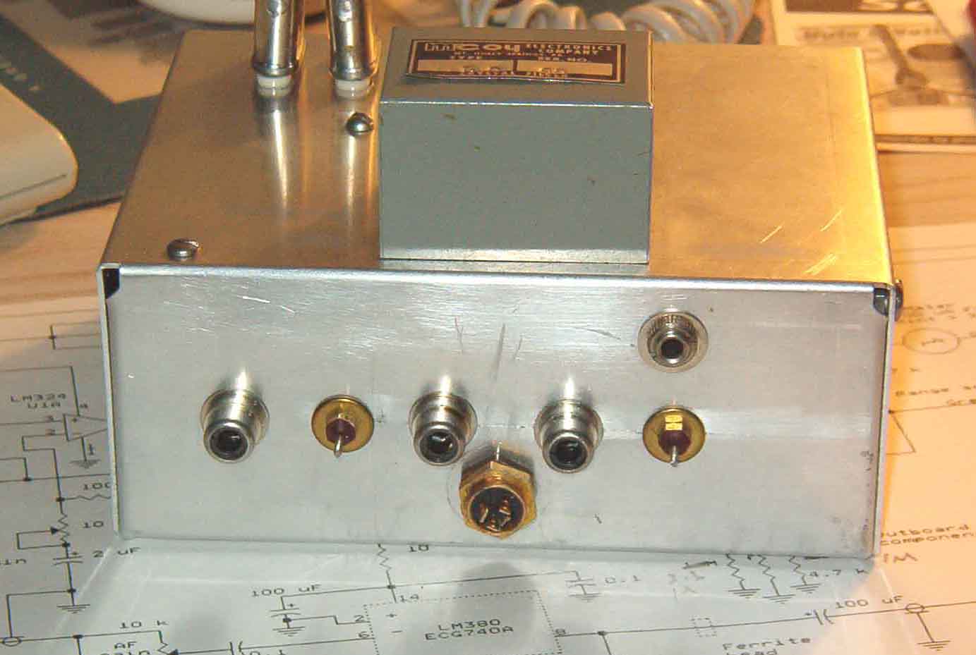 The unit's front-panel layout was also established, and an S-meter installed. A toggle switch is mounted for use as an AGC time-constant selector. The pair of ceramic crystal sockets are visible in this view. | ![]() |